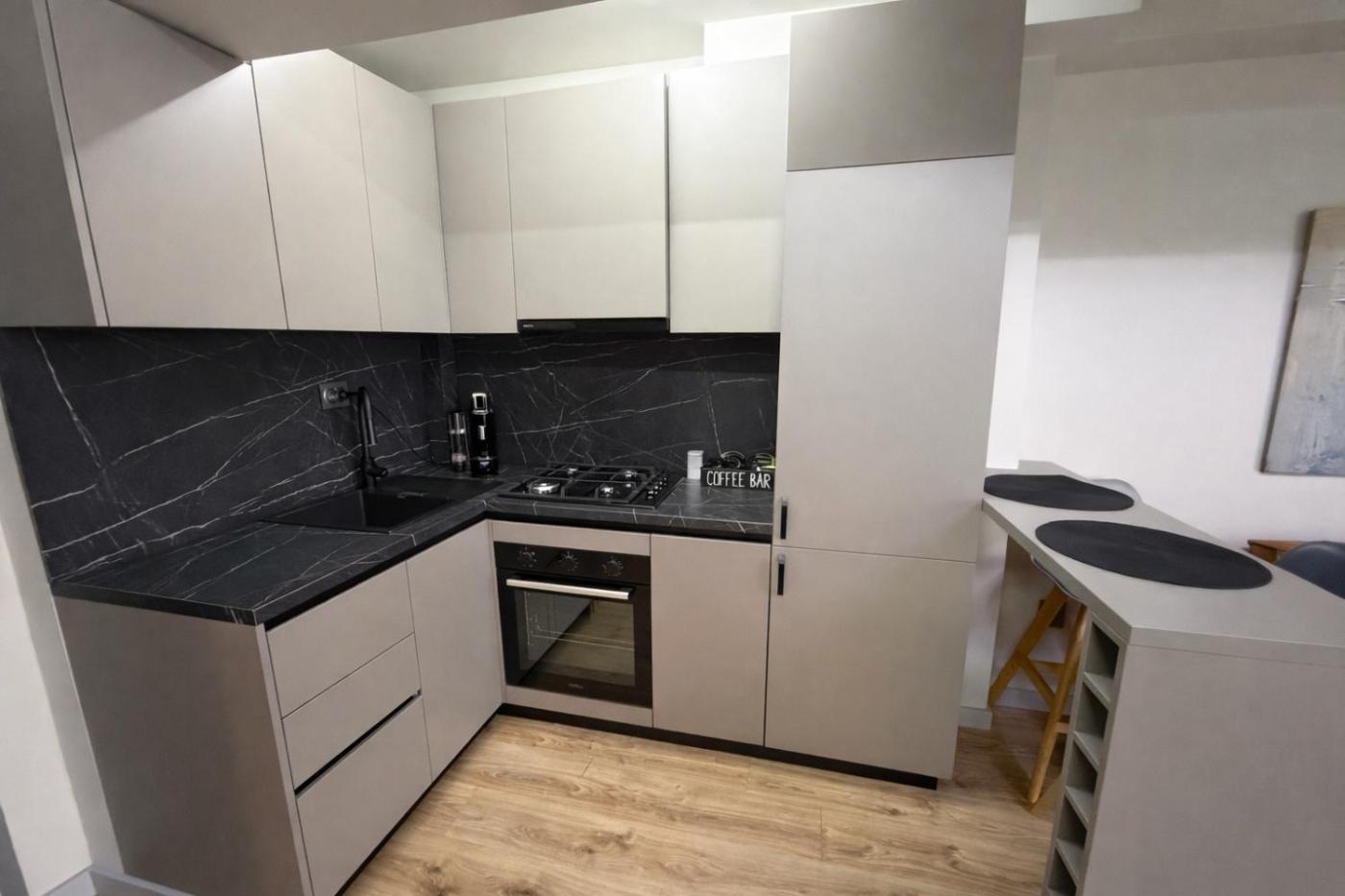 One-Bedroom Apartment. This apartment features 1 living room, 1 separate bedroom and 1 bathroom with a bath and free toiletries. The well-fitted kitchen has a refrigerator, kitchenware, an oven and a tea and coffee maker. This air-conditioned apartment includes a dining area, a flat-screen TV with satellite channels a washing machine and a balcony. The unit has 2 beds. ;
